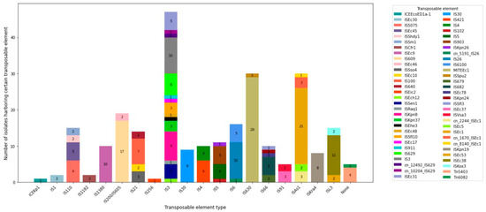 Similar to plasmids, the E. coli isolates also carried several IS elements, miniature inverted repeats, integrative conjugative elements, and transposons. At least four MGEs, other than plasmids, were detected. The MITEEc1 was found in all tested E. coli isolates. A total of fifty different IS elements belonging to twenty-one IS families were identified. The most abundant IS family was IS3, followed by ISAs1 and IS630. The most prevalent IS elements were ISEc1 and IS609, detected in 72.4% and 58.6% of all E. coli isolates, respectively. Additionally, ISEc38, IS26, and ISEc9 were found in 37.9%, 34.5%, and 34.5% of the isolates, respectively. Isolates carrying twelve different MGEs were the most predominant (14.8%), followed by isolates carrying seven, eight, eleven, and thirteen different MGEs (11.1%) each. Notably, 1 E. coli isolate carried 17 different MGEs, while 15 isolates carried 10 to 17 MGEs (Figure 4 and Supplementary Table S3). There was a significant association between genes determining resistance to aminoglycosides and the presence of IS3 (Fisher exact p = 0.01), IS5075 (Fisher exact p = 0.01) and IS629 (X2 = 4.821, p = 0.028). Similarly, a significant association was observed between genes determining β-lactam resistance and ISEc31 (Fisher exact p = 0.016), ISEc9 (Fisher exact p = 0.048), and ISSfl8 (Fisher exact p = 0.015). In addition, resistance to quinolones was significantly associated with the presence of ISEc9 (Fisher exact p = 0.001) and ISKpn19 (Fisher exact p = 0.003).