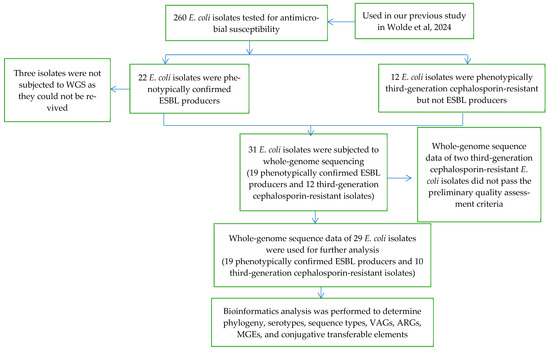 The current study is a continuation of a previous cross-sectional study conducted in Addis Ababa and Hossana from October 2021 to September 2022, in which 260 E. coli strains were isolated from patients of all ages and sexes recruited according to patient flow from 13 randomly selected health centers from 4 sub-cities (40% of the total) in Addis Ababa and all 4 health centers in Hossana [43]. For the current study, all E. coli isolates that showed phenotypic resistance to third-generation cephalosporin antibiotics or were identified as ESBL-producing were selected from the previous collection, because E. coli isolates exhibiting these characteristics are critically important for human medicine. The sampling method used in the current study is shown in Figure 5.