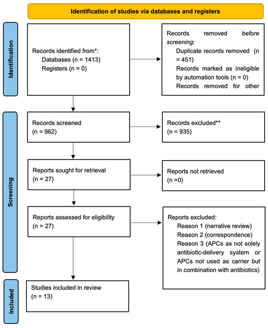 In total, the initial search strategies showed 1413 articles. After duplicate removal, 962 articles remained for title and abstract evaluation. A total of 935 papers were excluded due to a mismatch with inclusion criteria, and 27 articles were retained for final full text review. Finally, 13 articles [17,18,19,20,21,22,23,24,25,26,27,28,29] including 10 in vitro studies [17,18,19,20,22,23,25,26,27,28], 1 ex vivo study [24], 1 clinical study [21], and 1 in vitro and clinical study [29], which have, so far, evaluated the potential of APCs as an antibiotic delivery system, were selected. Reports were excluded for the following reasons: narrative reviews, correspondence, and APCs not used as antibiotic delivery systems (for completion, see Supplementary Table S1: excluded studies and reasons). By excluding these types of reports, the scoping review could ensure a more precise, relevant, and systematic mapping of the literature that directly addresses the specific research objectives [30]. The results of the selected studies were classified under the following subheadings: antibiotic loading capacity of APCs, release kinetics of antibiotics, and antibacterial effects of loaded APCs (in vitro or in vivo). Some studies touched upon different characteristics; therefore, they were included in two/three categories. Furthermore, potential interactions between antibiotics and the structure of APCs, as well as whether APCs modified the characteristics of antibiotics, were reported. The Preferred Reporting Items for Systematic Reviews and Meta-Analyses (PRISMA) flow diagram 2020 in Figure 1 depicts the flow of the included studies through each phase of the review process. The characteristics of the included studies are summarized in Table 3 (for completion, see Supplementary Table S2: summary of the outcomes evaluated in the included studies).