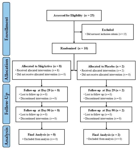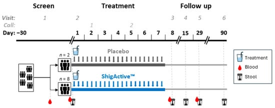 Ten participants were enrolled in this Phase 1 study on 23 March 2023 (Figure 1). The sample size was selected to rule out unacceptable toxicity before moving to a planned Phase 2a controlled human infection model of shigellosis (clinicaltrial.gov: NCT05182749). The Phase 1 demographics are summarized in Table 1. Half of the participants were male and half female, ranging in age from 23 to 42 years. Of those, 80% were white, 10% Black or African American, and 10% American Indian or Alaska Native. Eight were randomized to receive ShigActive™, while two were randomized to receive the placebo control. Twenty-one self-administered oral doses of ShigActive™ (1 × 1010 PFU/dose) or placebo per subject were planned over a 7-day period, approximately every 8 h, with follow-up through day 90 (Figure 2). Several deviations occurred in dosing administration. However, compliance with the total number of planned doses was >90%. Two subjects randomized to ShigActive™ missed either 1 (ID# 15, day 4) or 2 (ID# 24, one each on days 2 and 3) doses over the 7-day treatment period, while one placebo recipient had a single out-of-window dose on day 7.