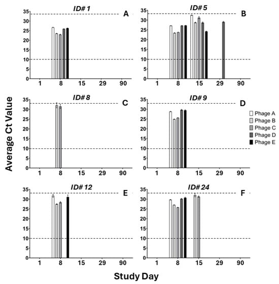 ShigActive™ monophage DNA detected in stool from ShigActive™-treated subjects using qPCR. Shown are the average Ct values for ShigActive™ monophage DNA in stool determined using qPCR performed in triplicate at the indicated timepoints for 6 out of 8 ShigActive™-treated subjects ([A] ID#1; [B] ID#5; [C] ID#8; [D] ID#9; [E] ID#12; [F] ID#24) with detectable levels of monophage DNA (Table S3). Samples were deemed positive for a monophage if the Ct value was >10 and <33, shown as dashed horizontal lines, in at least 2 out of the 3 replicates. Individual monophages (i.e., Phages A–E) are depicted by the shaded bars.