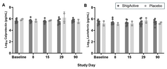Levels of inflammatory mediators in stool for each treatment group. Shown are the average levels (pg/mL) of (A) calprotectin (CP) and (B) lactoferrin (LF) in stool at the indicated timepoints for placebo- (light gray bars/symbols) and ShigActive™- (dark gray bars/symbols) treated subjects. Baseline samples are shown prior to the first dose and are from day 1, except for subject ID# 11, whose screening sample was used for baseline due to insufficient stool sample for day 1. Symbols represent the data points for each individual subject at the indicated timepoint. Error bars represent standard deviation.