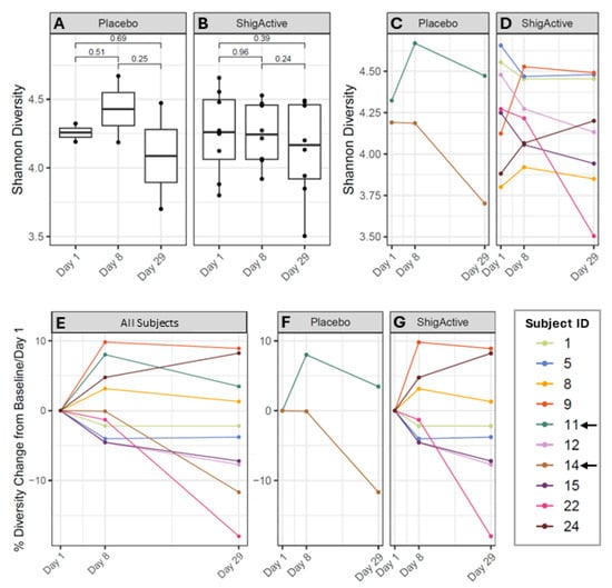Longitudinal alpha diversity changes for each treatment group. (A,B) Average Shannon diversity values from baseline/day 1 through day 29 separated by treatment. p-values are shown by brackets. (C,D) Individual Shannon diversity changes at each study timepoint for each participant separated by treatment. Percent Shannon diversity change compared to baseline/day 1 for (E) all subjects, or separated by (F) placebo or (G) ShigActive™ treatment groups. Arrows highlight placebo-treated subjects.