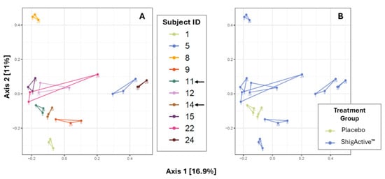 Since each participant exhibited a different baseline Shannon diversity, we blindly calculated the percent Shannon diversity change from baseline/day 1 (prior to first dose). This allowed for easier visualization that there were no longitudinal trends present (Figure 5E–G) where 5 participants exhibited a decreased diversity from baseline to day 8; 4 participants showed an increase; and 1 participant remained at their baseline level. All analyses were initially performed blinded. Upon unblinding, there were no significant percent diversity changes observed for the placebo or ShigActive™ recipients (t-test, p = 0.26 and p = 0.25, respectively). Additionally, incidence of AEs did not appear to correlate with diversity changes as 2 of the 4 (50%) ShigActive™-treated subjects who experienced at least 1 AE had increased changes (Subject IDs #8 and 24, Figure 5D,G), while the other 2 (50%) had decreased changes (Subject IDs #1 and 15, Figure 5D,G).