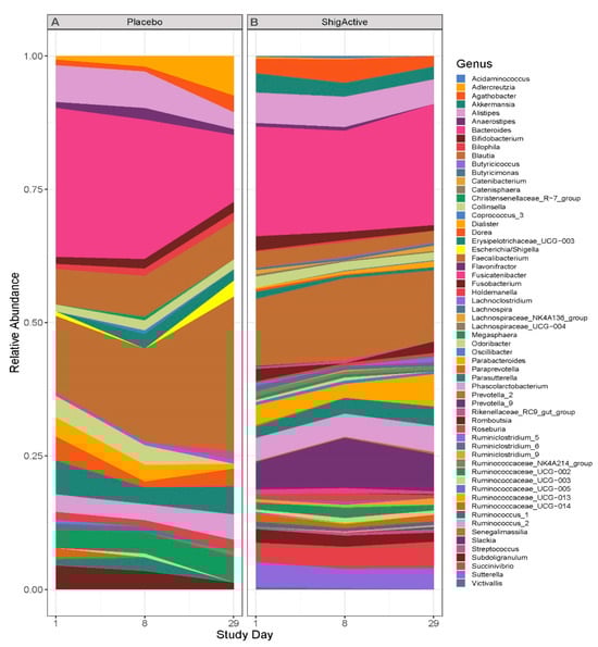 Longitudinal taxonomic differences observed across the two treatment groups through day 29. The average relative abundance for each bacterial genus from day 1 (baseline) through day 29 for the (A) placebo- or (B) ShigActive™-treated groups. Only genera with relative abundance that are greater than 1% are shown. Relative abundance for each bacterial genus graphed by individual subject is shown in Figure S1.