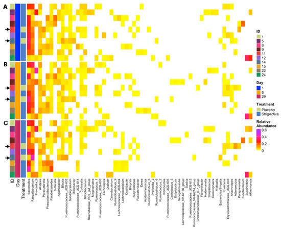 Heatmap displaying the taxonomic distributions using relative abundances. Each study day was plotted separately ((A), day 1/baseline [blue]; (B), day 8 [orange]; (C), day 29 [maroon]), with each sample shown along the y-axis. The participant IDs (column 1), study day (column 2), and treatment assignment (column 3) are marked on the left side of the heatmap. Arrows highlight placebo-treated subjects. Only genera with relative abundance that are greater than 1% are shown.