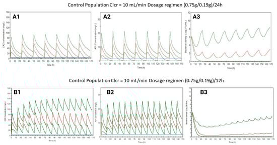 Ceftazidime (1) and avibactam (2) plasma level curves, and bacterial growth (3) levels simulated for control patients with Clcr = 10 mL/min using the dosage regimen from the SmPC ((0.75/0.19)/24) (A) or the suggested regimen ((0.75/0.19)/12) (B). Blue line: MIC value (4 mg/L for CAZ and 1 mg/L for AVI). Red line: mean. Green line: 5/95%.