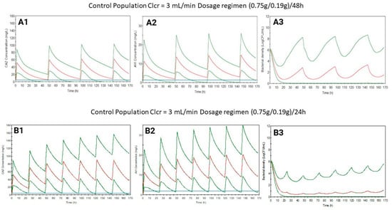 Ceftazidime (1) and avibactam (2) plasma level curves, and bacterial growth (3) levels simulated for control patients with Clcr = 3 mL/min using the dosage regimen from the SmPC ((0.75/0.19)/48) (A) or the suggested regimen ((0.75/0.19)/24) (B). Blue line: MIC value (4 mg/L for CAZ and 1 mg/L for AVI). Red line: mean. Green line: 5/95%.