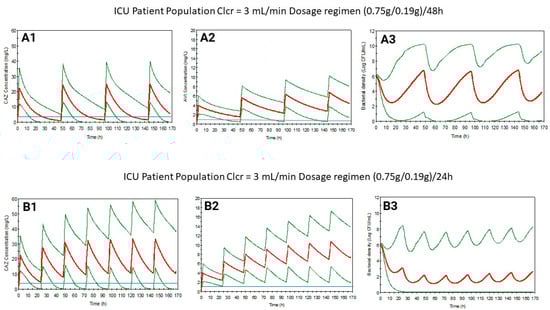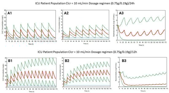 Ceftazidime (1) and avibactam (2) plasma level curves, and bacterial growth (3) levels simulated for ICU patients with Clcr = 10 mL/min using the dosage regimen from the SmPC ((0.75/0.19)/24) (A) or the suggested regimen ((0.75/0.19)/12) (B). Blue line: MIC value (4 mg/L for CAZ and 1 mg/L for AVI). Red line: mean. Green line: 5/95.