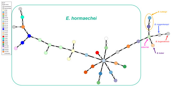 26. Hoffmann, H.; Stindl, S.; Ludwig, W.; Stumpf, A.; Mehlen, A.; Monget, D.; Pierard, D.; Ziesing, S.; Heesemann, J.; Roggenkamp, A.; et al. Enterobacter hormaechei subsp. oharae subsp. nov., E. hormaechei subsp. hormaechei comb. nov., and E. hormaechei subsp. steigerwaltii subsp. nov., three new subspecies of clinical importance. J. Clin. Microbiol. 2005, 43, 3297–3303. [Google Scholar] [CrossRef] [PubMed]
