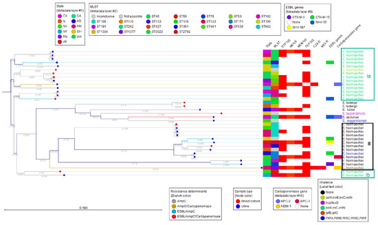 29. Dong, X.; Zhu, M.; Li, Y.; Huang, D.; Wang, L.; Yan, C.; Zhang, L.; Dong, F.; Lu, J.; Lin, X.; et al. Whole-Genome Sequencing-Based Species Classification, Multilocus Sequence Typing, and Antimicrobial Resistance Mechanism Analysis of the Enterobacter cloacae Complex in Southern China. Microbiol. Spectr. 2022, 10, e0216022. [Google Scholar] [CrossRef]