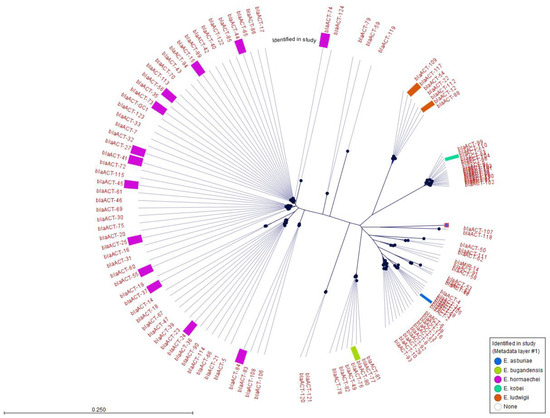 AmpC beta-lactamase genes were identified in all of the Enterobacter isolates. Thirty-four of thirty-five isolates contained a blaACT allele; however, the E. roggenkampii isolate (17,310) contained a different AmpC-type beta-lactamase, blaMIR-5 (with 99.48% sequence identity to the blaMIR-5 reference gene). A BLAST search of the contig containing the genomic environment surrounding the blaMIR-5 gene of isolate 17,310 also returned a 99% match to the chromosome of a published E. roggenkampii strain (GenBank accession CP056737.1). Eighteen different blaACT genes were detected among the thirty-four isolates (Figure 3). Among the 29 isolates identified as E. hormaechei by ANI, 14 different blaACT genes were detected, although many clustered in highly related branches (Figure 3). The two E. ludwigii isolates had different but highly related blaACT alleles (blaACT-12 and blaACT-117; Figure 3). The blaACT-80 from E. bugandensis and the blaACT-52 from E. kobei were on distinct branches of the blaACT phylogenetic tree, while the blaACT-3 from E. asburiae, while also on a distinct branch, was more closely linked to other blaACT alleles (Figure 3). Thus, the presence of specific blaACT alleles was aligned with their Enterobacter species host.