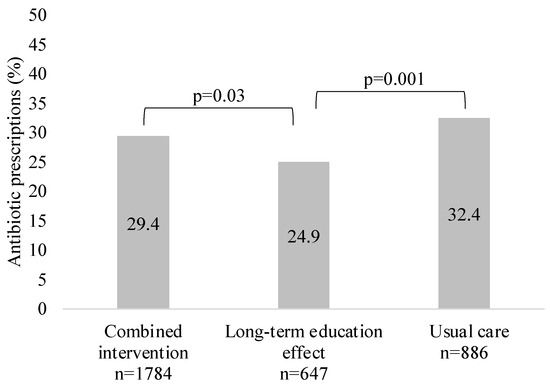 Overall, 29.3% of the study patients (n = 972) received antibacterial treatment (immediate or delayed prescription). The lowest prescribing was observed in the GP group, with a long-term education effect. The proportion of patients treated with antibiotics in each study group is shown in Figure 2.