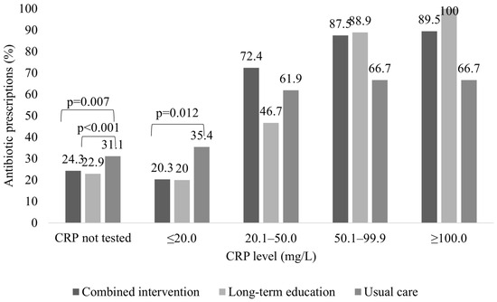 Antibiotics were more often prescribed to patients without CRP testing in the usual care group than in the combined intervention (31.1% vs. 24.3%, p = 0.007) or long-term education group (31.1% vs. 22.9%, p < 0.001). Similarly, the combined intervention group prescribed significantly fewer antibiotics for patients with CRP below 20 mg/L than the usual care group (20.3% vs. 35.4%, p = 0.012). Patients with CRP levels above 20 mg/L were more frequently treated with antibiotics in all study groups, and no significant differences were observed between the groups for these patients. (Figure 3).