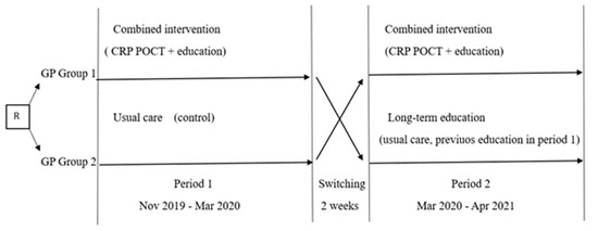 In the first period, the GPs in Group 1 received two interventions (CRP POCT and a live educational session), and Group 2 continued usual care as a control (Figure 4). Recruitment during the first period took place between November 2019 and March 2020. The results of the first period of the study are published [19].