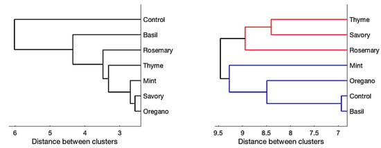 After standardization, the data in Table 2 and Table 3 were clustered using an unweighted average distance binary (UPGMA) clustering algorithm; the dendrogram is shown in Figure 1 (left). All types of honey showed significantly diverse behavior with respect to the control. Oregano, thyme, mint, savory, and rosemary honey were similar, with basil deviating slightly. Applying the same approach with respect to the data reported in Tables S1 and S2 (Figure 1, right), we can quickly identify two clusters: the first red-colored cluster containing thyme, savory, and rosemary honey and the second cluster (blue-colored) formed by oregano, mint, basil, and the control. In particular, basil showed results very close to the control.