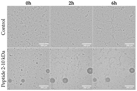 Capillary-like tube formation by HUVEC. Representative images of cells after 0 h, 2 h and 6 h of cells seeding on top of Matrigel in F12-K medium supplemented with 250 µg/mL peptides (2–10 kDa), or 1% (v/v) ethanol (Control). Scale bar corresponds to 200 µm.