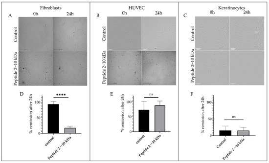 Wound healing assay. Representative images of the wound healing assay at 0 h and 24 h after incubation with 1% (v/v) ethanol (control) or 250 µg/mL of peptides (2–10 kDa) in (A) normal dermal fibroblasts, (B) HUVEC, and (C) keratinocytes. Scale bars correspond to 200 µm. Percentage of wound scratch closure (% remission) after 24 h incubation with 1% (v/v) ethanol (control) or 250 µg/mL of peptides (2–10 kDa) in (D) normal dermal fibroblasts, (E) HUVEC and (F) keratinocytes. Bars represent the mean ± SEM of at least two independent experiments. **** p value < 0.0001, ns—statistically not significant.