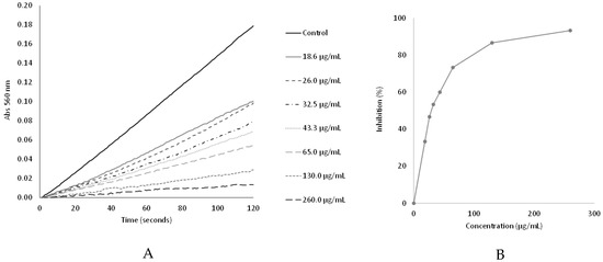 Superoxide scavenging capacity: (A) Plot of absorbance (Abs 560 nm) as a function of time for the different peptides concentrations; (B) Effect of the peptides on the inhibition of the NBT reduction by the PMS/NADH generated superoxide radical.
