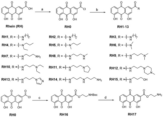 The research on the structural modification of RH mainly focuses on the 1,8-dihydroxy and 3-carboxyl positions of RH [14]. According to the analysis of RH, emodin methyl ether, and other homologues, the key component that exerts antimicrobial activity are 1,8-dihydroxy moieties. Therefore, we mainly modify RH by modifying its carboxyl group. The synthetic route of all target compounds, RH1–17, is described in Figure 1. Rhein was treated with oxalyl chloride at reflux temperature in dichloromethane (DCM) solution to yield intermediate RH0. The acetamide derivatives of RH were prepared by adding the corresponding amines into intermediate RH0, and the ammonolysis reaction was completed at room temperature. The structures of derivatives (RH1–17) were characterized by nuclear magnetic resonance and mass spectrometry.