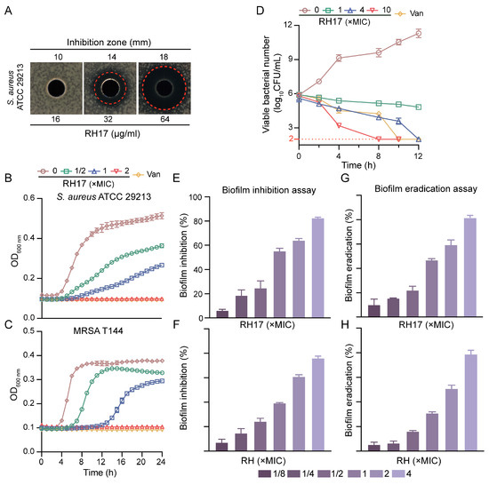 The antibacterial potency of RH17. (A) Antimicrobial activity of RH17 against S. aureus ATCC 29213. (B,C) Effect of varying concentrations of RH17 on growth curves of S. aureus isolates. The presented data are depicted as means ± standard deviation (SD). (B) S. aureus ATCC 29213; (C) MRSA T144. (D) Time-kill curve of S. aureus ATCC 29213 at different concentrations of RH17. (E–H) The antibiofilm activity of RH17 and RH. (E,F) RH17 and RH treatment inhibited biofilm formation on S. aureus ATCC 29213 after 24 h. (E) RH17; (F) RH. (G,H) RH17 and RH eradicated 24 h pre-formed S. aureus ATCC 29213 biofilms. (G) RH17; (H) RH.