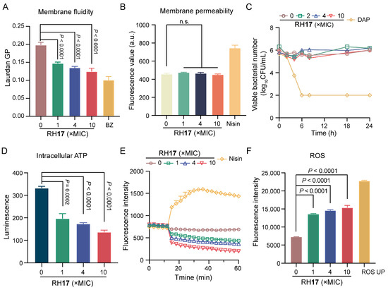 The antibacterial mechanism of RH17. (A) The fluidity of the membrane was decreased for S. aureus ATCC 29213 after treatment with RH17 for 1 h. Benzyl alcohol (BZ) at 50 mM was used as the positive control. (B) There were no effects on the membrane permeability for S. aureus ATCC 29213 after treatment with RH17 for 1 h. Nisin at 200 μg/mL was used as the positive control. (C) The effect of RH17 on the time-kill curves of S. aureus ATCC 29213 arrested by cold temperature (0 °C in an ice-water bath) showed no significant impact. Daptomycin (DAP) was used as the positive control, which demonstrated strong bactericidal activity under the same conditions. (D) The effect of RH17 on S. aureus ATCC 29213 after 1 h treatment showed a reduction in intracellular ATP levels. (E) The effect of RH17 on S. aureus ATCC 29213 showed a decrease in fluorescence intensity. Nisin at 200 μg/mL was used as the positive control. (F) The effect of RH17 on S. aureus ATCC 29213 after 1 h treatment resulted in increased ROS production. ROS UP at 500 μg/mL was used as the positive control. A p-value of “n.s.” means not significant, suggesting no meaningful difference between groups.