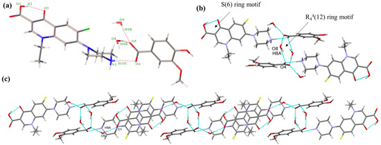 NORF—3,5-DBA hydrate crystallizes in the monoclinic system, space group P21/c, with an asymmetric unit consisting of one NORF, one 3,5-DBA, and two water molecules. The stoichiometric ratio of NORF, 3,5-DBA, and water molecules is 1:1:2. There is proton transfer from 3,5-DBA to the piperazine N1 of NORF. A molecule of water acts as a bridge connecting NORF and 3,5-DBA (N1-H1A ··O11, 1.968 Å, 156.46°; O11-H11A···O7, 1.830 Å, 168.23°) (Figure 2a). In addition, an intramolecular hydrogen bond (O6-H6···O5, 1.723 Å, 155.26°) is present with an S(6) ring motif in NORF. Two asymmetric units form the R44(12) ring motif by O-H···O hydrogen bonds (O11-H11B···O8, 1.876 Å, 164.96°) (Figure 2b). The ring motifs interact with each other via a N-H···O hydrogen bond (N1-H1B···O12, 1.912 Å, 162.90°), leading to the formation of a one-dimensional (1D) chain (Figure 2c).