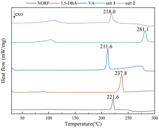 DSC curves of NORF, 3,5-DBA, VA, salt 1, and salt 2.