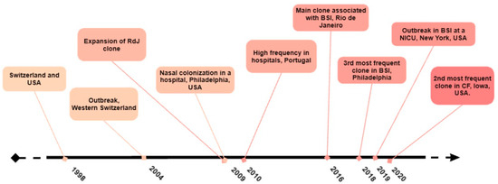 However, an increased prevalence of ST105 was observed in other European regions. Espadinha et al. analyzed the variations in the sample profile of MRSA obtained during two time periods, 1993 and 2010, and detected a clonal shift at a major tertiary teaching hospital in Portugal. By 2010, ST105 was found to be the second most frequent clone in the hospital (18.0%), trailing behind the dominant ST22-SCCmecIVh (72.0%) [68]. Furthermore, Faria et al. (2013) found that ST105-SCCmecII was the second most common MRSA in Portuguese hospitals, accounting for 19.0% [69]. Figure 1 provides a timeline summary of the major emergence events associated with ST105 MRSA strains.