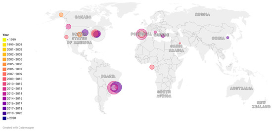 Representative map showing the occurrence of Sequence-type (ST)105 around the world. Each circle represents a scientific article in which ST105 was reported. The size of the circles indicates the percentage of ST105 reported among the collection included in each study. The colors indicate the date (in years) of the sample collection. For studies performed in a large period of years, the last year of the reported period was considered.