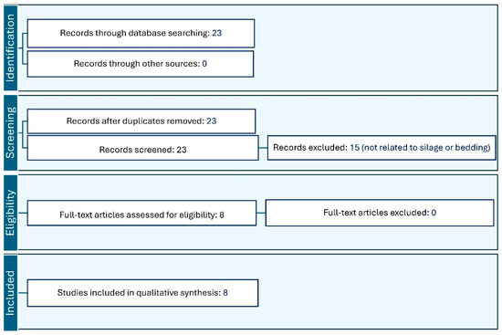 To identify pertinent studies, a search was conducted using four databases accessed through the following interfaces: Web of Science (covering three databases: the Science Citation Index Expanded (SCI-EXPANDED), the Emerging Sources Citation Index (ESCI), and the Conference Proceedings Citation Index—Science (CPCI-S)) and Scopus using the following Boolean search term: (“antimicrobial resistance” OR “AMR”) AND (genes OR bacteria) AND dairy AND (bedding OR silage). No restrictions were placed on the date of publication.