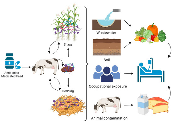 Free and intracellular ARGs can enter the animal gut by consuming water or contaminated feed and ultimately be released via excreted feces into the farm environment, including bedding materials [88]. ARGs from silage and bedding could be transferred directly to humans through occupational exposure at the farm level or indirectly through contaminated soil and wastewater at animal production facilities (Figure 2) [89]. In addition, these genes might be transferred by pathogens (intracellular ARGs), either directly from bedding or from the milking system to the animal teats and udder to finally find their way into milk, as well as being transferred through the milking system to other cows [90,91]. The risk of transfer to humans would then depend on the processing steps and the type of dairy product consumed [92]. While pasteurization is effective in reducing the risk of illness caused by harmful bacteria in milk, some consumers prefer to consume raw milk and raw milk products. Outbreaks related to unpasteurized dairy products have been linked to multiple types of microorganisms, such as Campylobacter spp., L. monocytogenes, E. coli, Streptococcus bovis, Brucella spp., Salmonella spp., and other enteric pathogens. Additionally, some thermoduric microorganisms, such as B. cereus, can survive the pasteurization process [93,94,95].