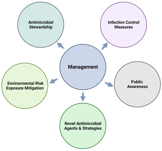 Despite growing concerns about AMR, it is important to recognize that AMR is not universal and does not affect all pathogens equally. In fact, although particular pathogens/bacteria are progressively developing resistance to antibiotics that are used therapeutically, it should not be assumed that all antibiotics abruptly lose effectiveness against all bacteria [117]. Based on the level of concern for human health, Kadri et al. [118] have classified AMR under three categories, including serious, concerning, or urgent. For instance, carbapenem-resistant bacteria are considered urgent, as carbapenem is a “last-resort” antibiotic for treating infections with multi-drug resistance. The advent of carbapenem-resistant bacteria poses major concerns to public health [119,120]. Increasing resistance to third-generation cephalosporins, carbapenems, and last-resort antibiotics has caused the WHO to invest in further research into developing novel drugs/molecules discovery against priority-resistant pathogens [119,120]. To mitigate this issue, several countries have banned or restricted the use of certain antibiotics in animal husbandry [5]. For example, the European Union has prohibited the use of antibiotics as a means of promoting growth in animals since 2006, and the use of several antibiotics, including colistin, specific cephalosporins, and fluoroquinolones, has been restricted for animal use [5]. In North America, the FDA and Health Canada have taken steps to phase out the use of antibiotics for growth promotion and have implemented regulations to ensure that antibiotics are only used for therapeutic purposes under the supervision of a licensed veterinarian [121,122]. Veterinarians play a crucial role in guiding decisions related to antibiotic treatments. It is essential for these professionals to evaluate disease signs, accurately diagnose infections, and prescribe suitable treatments tailored to the individual needs of the animal [40,123]. Furthermore, antibiotic classification systems have been established to guide healthcare professionals in making informed choices and practicing antibiotic stewardship. These classification systems categorize antibiotics based on their spectrum of activity, mechanism of action, and importance in human and veterinary medicine [124,125]. By classifying antibiotics, healthcare providers can better understand their effectiveness, potential risks, and appropriate usage [126]. Such classifications facilitate the development of guidelines and protocols that promote responsible antibiotic use, support antimicrobial stewardship efforts, and help mitigate the emergence and spread of antimicrobial resistance [124,125]. In February 2019, Canada introduced a new regulation that limits the use of antimicrobials categorized as very important for human medicine in all animals used for food production. These antimicrobials, called Category 1 antimicrobials in Canada, primarily include third- and fourth-generation cephalosporins, polymyxins, and fluoroquinolones in animal farming [126]. In addition, the Canadian dairy sector established a compulsory nationwide quality assurance initiative called proAction (https://www.dairyfarmers.ca/proaction, accessed on 12 February 2024). This program mandates the maintenance of farm records concerning medical treatments, including antimicrobials. In order to efficiently address the public health issue of AMR, mitigating strategies require understanding the sources and mechanisms of transfer of resistance and applying an organized approach with the help of microbiologists, physicians, pharmacists, veterinarians, patients, and farmers [127,128].