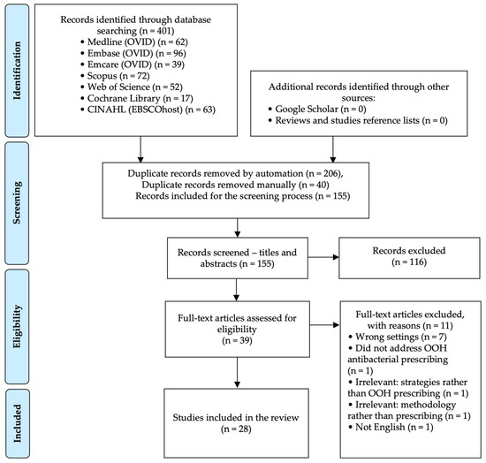 Overall, 401 citations were retrieved from the electronic database searches, of which 246 were duplicates. Screening of the titles and abstracts was carried out on 155 records, where 116 citations were excluded. A total of 39 articles were eligible for full-text screening, of which 28 studies were included in the review. The reasons for excluding articles are reported in Figure 1.