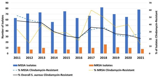 Cases of invasive clindamycin-resistant CA-MRSA infections in children cared for at a 973-bed tertiary US children’s hospital from January 2011 to December 2021 were prospectively identified through an ongoing S. aureus surveillance study which has been previously described []. Briefly, all S. aureus isolates identified by the hospital’s clinical microbiology laboratory in the routine course of care are sub-cultured, transported to the Infectious Diseases Research Laboratory and stored frozen in horse blood pending additional characterization. Clinical and demographic metadata associated with each isolate are prospectively recorded and stored securely in an electronic database. The Surveillance Study captures isolates identified in cultures obtained at three geographically distinct campuses in our hospital system. Isolates were routinely tested for susceptibility to oxacillin, clindamycin, trimethoprim-sulfamethoxazole and vancomycin by the hospital clinical microbiology laboratory using standard methods. Our center has historically had high rates of endemic CA-MRSA; in work from the mid-2000s at our institution, MRSA accounted for >60% of community-associated (CA)-S. aureus infections at its peak frequency [,,]. For cases of clindamycin-resistant CA-MRSA, clinical and microbiologic data were obtained through review of the electronic medical record (EMR) and imported into an electronic case report form. Our center’s EMR includes all inpatient and outpatient encounters across an integrated system including three hospital campuses, twelve urgent care centers, and 51 affiliated primary care practices. Invasive infections included bacteremia, complicated pneumonia, septic arthritis, osteomyelitis, pyomyositis, and deep abscesses. For this study, only CA infections were eligible for inclusion []. CA infections were regarded as those occurring in (1) children lacking major medical comorbidities predisposing to frequent hospital admissions (e.g., congenital heart disease, malignancy, primary immunodeficiency, cystic fibrosis, etc.), and (2) with identification of S. aureus in the outpatient setting or within 48 h of hospital admission. Patients were excluded if they had an underlying comorbidity predisposing to frequent hospitalization; well-controlled asthma and eczema were not regarded as major comorbidities. All cases of clindamycin-resistant CA-MRSA were individually reviewed to confirm eligibility and cases with uncertainty regarding community-acquisition were discussed among investigators and a consensus reached.