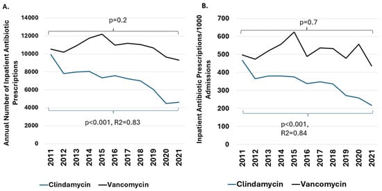 Trends in Inpatient Antibiotic Prescriptions. Panel (A). Annual number of inpatient prescriptions for vancomycin and clindamycin. Panel (B). Annual number of inpatient prescriptions for vancomycin and clindamycin adjusted for 1000 hospital admissions. A statistically significant decline in clindamycin prescriptions and prescriptions/1000 hospitalizations was observed (p < 0.001, R2 = 0.84). The frequency of vancomycin prescribing did not significantly change.