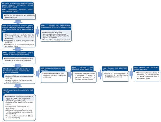 The evolution of EU water law regulations, along with the proposed changes in the context of preventing pharmaceutical and AMR pollution, is presented in Figure 1.