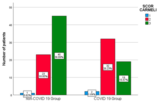 An analysis of the Carmeli score data indicated that most of the non-COVID-19 patients had a Carmeli score of 3 upon admission, whereas those with COVID-19 had a Carmeli score of 2 (p = 0.005; Figure 1).
