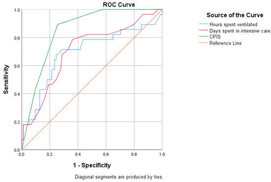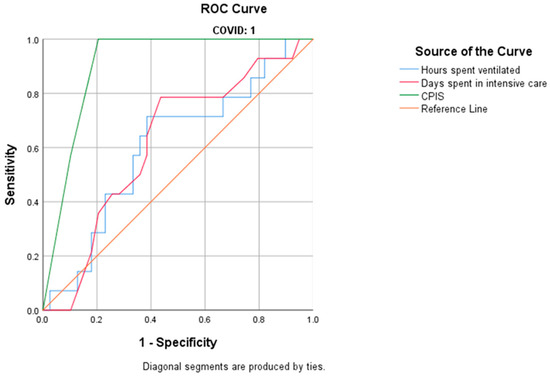 We performed univariate analysis to assess the diagnostic performance of multi-drug resistance, the dependent variable, about each of the independent variables (days spent in intensive care, hours spent on ventilation, and CPIS). The analysis was conducted for each of the three patient groups: COVID-positive, COVID-negative, and all patients combined. Each variable was examined individually through a univariate analysis. We utilized a ROC curve to evaluate the diagnostic capability of each variable. The optimal cut-off value was determined using the Youden Index, which maximizes the sum of sensitivity and specificity for each analysis.