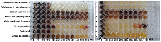 | OCT | CHX | PHMB | PVI | ET | BA | NaOCl | KMnO4 | |
