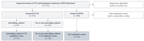 Between March 2019 and March 2021, 775 suspected UTI and RTI infection events were abstracted; five duplicate records and any suspected infection that did not result in the prescription of an antibiotic were removed (n = 400). Per the McGeer criteria, UTI infections were separated by the presence or absence of an indwelling catheter or non-indwelling during urine collection. Both suprapubic and foley catheters were considered “indwelling”. The final sample consisted of 208 UTIs (indwelling n = 53, non-indwelling n = 155) and 162 RTI suspected infections that resulted antibiotic events (Figure 1).