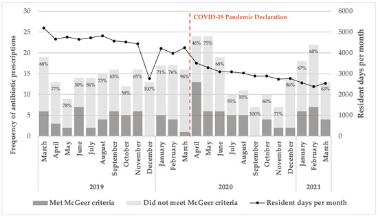 The proportion of prescriptions that did not meet the McGeer criteria fluctuated between March 2019 and March 2021. Notably, 100% of antibiotic prescriptions for suspected bacterial infections in December 2019 and 94% in March 2020 were classified as inappropriate. Resident days per month in the SNF steadily declined from approximately 5000 in March 2019 to around 3000 by March 2021 (Figure 2).