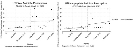 Our second objective assessed changes in antibiotic prescribing practices relative to the onset of the pandemic. We conducted an ITS to determine whether prescribing patterns differed following the onset of the COVID-19 pandemic in Arizona [25]. Two separate models were run for UTIs and RTIs. The first of which modeled the number of inappropriate antibiotic prescriptions, and the second modeled the total number of antibiotic prescriptions (appropriate and inappropriate). The outcome was the number of inappropriate or total prescriptions per 1000 resident days, and the onset of the pandemic was March 2020. Study time in months (1–25) was used to set the data. The equation representing this model is shown below [26].