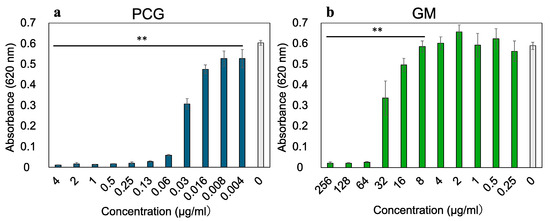 The growth inhibition of PCG and GM against S. sanguinis was evaluated by measuring absorbance at 620 nm, and then compared to an untreated control (0 µg/mL PCG and GM). PCG and GM significantly inhibited the growth of S. sanguinis at concentrations of 0.06 μg/mL and 64 μg/mL, respectively; therefore, these were determined as the MICs.