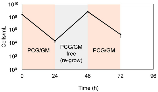 Persister formation in S. sanguinis following PCG/GM treatment and recovery in BHIY medium. After treatment with PCG (1600 μg/mL)/GM (64 μg/mL) for 24 h, the medium was changed to BHIY only, and cells were incubated at 37 °C in 5% CO2 for 24 h. The regrown S. sanguinis was retreated with the same concentration of PCG/GM for 24 h. Error bars indicate the standard deviation across at least three biological replicates.