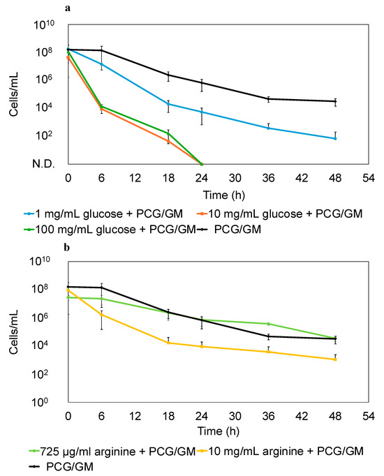 Bactericidal effect of PCG (1600 μg/mL)/GM (64 μg/mL) on S. sanguinis in M9 minimal medium following the addition of glucose (1, 10, or 100 mg/mL) (a) and arginine (725 μg/mL or 10 mg/mL) (b). The CFU were measured at 0, 6, 18, 24, 36, and 48 h. Error bars indicate the standard deviation from at least three biological replicates. N.D. indicates not detected.