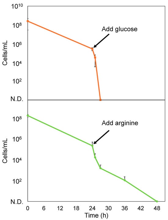 Initially, an experiment in which antibiotics and glucose were simultaneously applied was conducted. S. sanguinis reinoculated culture (OD600 = 0.4) was centrifuged at 4000× g for 10 min. The bacterial pellets were resuspended in M9 minimal medium containing PCG (1600 μg/mL)/GM (64 μg/mL) and 1, 10, or 100 mg/mL of glucose (Tokyo Chemical Industry Co., Ltd., Tokyo, Japan) or arginine (725 μg/mL or 10 mg/mL) (FUJIFILM Wako Pure Chemical Co., Ltd., Osaka, Japan), and incubated for 6, 18, 24, 36, and 48 h (37 °C, 5% CO2). To accurately determine the effects of glucose and arginine, M9 was used instead of BHIY medium, which is less affected. After each incubation period, the cells were washed twice with PBS, and tenfold serial dilutions were prepared and spotted on BHIY agar plates to measure the CFU. Following this, an experiment was conducted, in which glucose or arginine was applied to the persisters that survived the antibiotic treatment. S. sanguinis cultured under the same conditions was treated with M9 minimal medium containing PCG/GM for 24 h and centrifuged at 4000× g for 10 min to collect the persister cells. The cells were washed twice with PBS and treated with M9 minimal medium containing PCG/GM and glucose or arginine (10 mg/mL). The cells were then incubated for 1, 3, 6, 18, or 24 h. After each incubation period, the cells were washed twice with PBS, tenfold serial dilutions were prepared, spotted on BHIY agar plates, and the CFU were measured. In both experiments, controls were treated with M9 minimal medium containing PCG/GM.