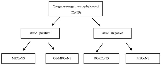 Among multiple mechanisms of acquired drug resistance displayed by CoNS, the resistance to beta-lactam antibiotics appears the most important from a clinical and epidemiological perspective [6]. The two principal mechanisms of staphylococcal resistance to beta-lactams include the production of enzymes, beta-lactamases, and mutated penicillin-binding proteins (PBP) [7]. Due to the generation of new PBP, with low affinity to beta-lactams, staphylococci become resistant to all beta-lactam antibiotics used in clinical practice nowadays, except for fifth-generation cephalosporins (ceftaroline and ceftobiprole) [8]. This type of resistance is referred to as methicillin or oxacillin resistance, as it was first documented in the case of methicillin, the first semisynthetic anti-staphylococcal penicillin [9]. CoNS displaying this type of resistance are called methicillin-resistant coagulase-negative staphylococci (MRCoNS). Methicillin resistance is determined by the presence of acquired mecA, mecB, or mecC genes (previously known as mecALGA251) that encode additional penicillin-binding proteins, PBP2a (PBP2’), PBP2b, or PBP2c, respectively [10,11]. mecA and mecC are chromosomal genes that are part of the staphylococcal cassette chromosome mec (SCCmec) [12].
