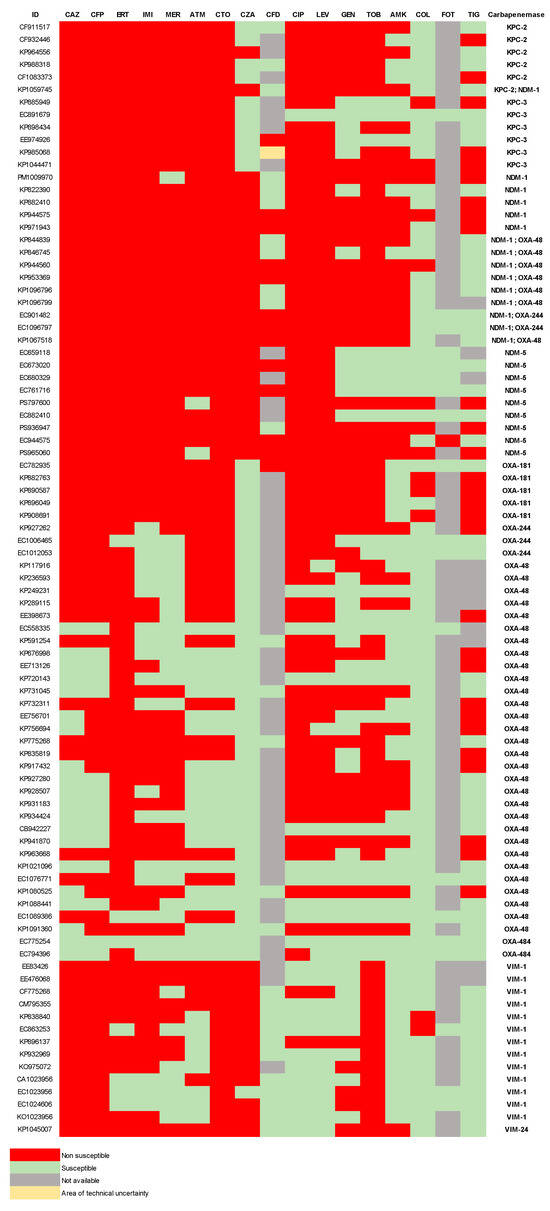 Heatmap of antibiotic susceptibility pattern by isolate. Heatmap showing susceptibility profiles and carbapenemase of each isolate. Green: susceptible; red: non-susceptible, grey: not available; yellow: area of technical uncertainty. ID: sample identification number. CAZ: ceftazidime; CFP: cefepime; ERT: ertapenem; IMI: imipenem; MER: meropenem; ATM: aztreonam; CTO: ceftolozane–tazobactam; CZA: ceftazidime–avibactam; CFD: cefiderocol; CIP: ciprofloxacin; LEV: levofloxacin; GEN: gentamicin; TOB: tobramycin; AMK: amikacin; COL: colistin; FOT: fosfomycin; TIG: tigecyclin.