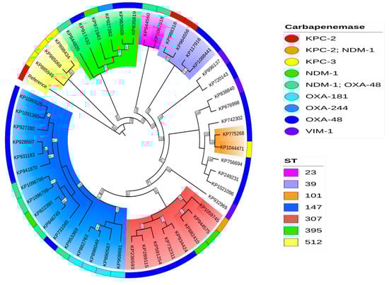 The phylogenetic analysis of carbapenem-producing K. pneumoniae. The phylogenetic analysis of K. pneumoniae sensu stricto. The cladogram depicts the relationships among isolates. Inner shading indicates the ST of each isolate. Isolates without shading represent unique STs. The outermost circle highlights the carbapenemase associated with each isolate. Bootstrap values exceeding 70 are displayed in white-background boxes on the respective branches.